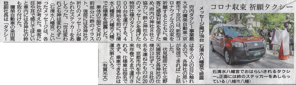 2020年12月4日から随時運行を開始した「神様の祈りの鈴タクシー」について、11月30日に石清水八幡宮様で行われた出発披露の模様が2020年12月2日付京都新聞朝刊に掲載されました。