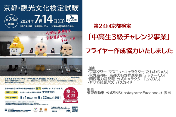 彌榮自動車株式会社(ヤサカグループ本社、以下:彌榮自動車)ならびにヤサカ観光バス株式会社(以下:ヤサカ観光バス)は、第24回京都・観光文化検定試験(通常:京都検定、以下:同)の「中高生3級チャレンジ事業」のフライヤー作成に企画構想段階から協力いたしましたことをお知らせいたします。